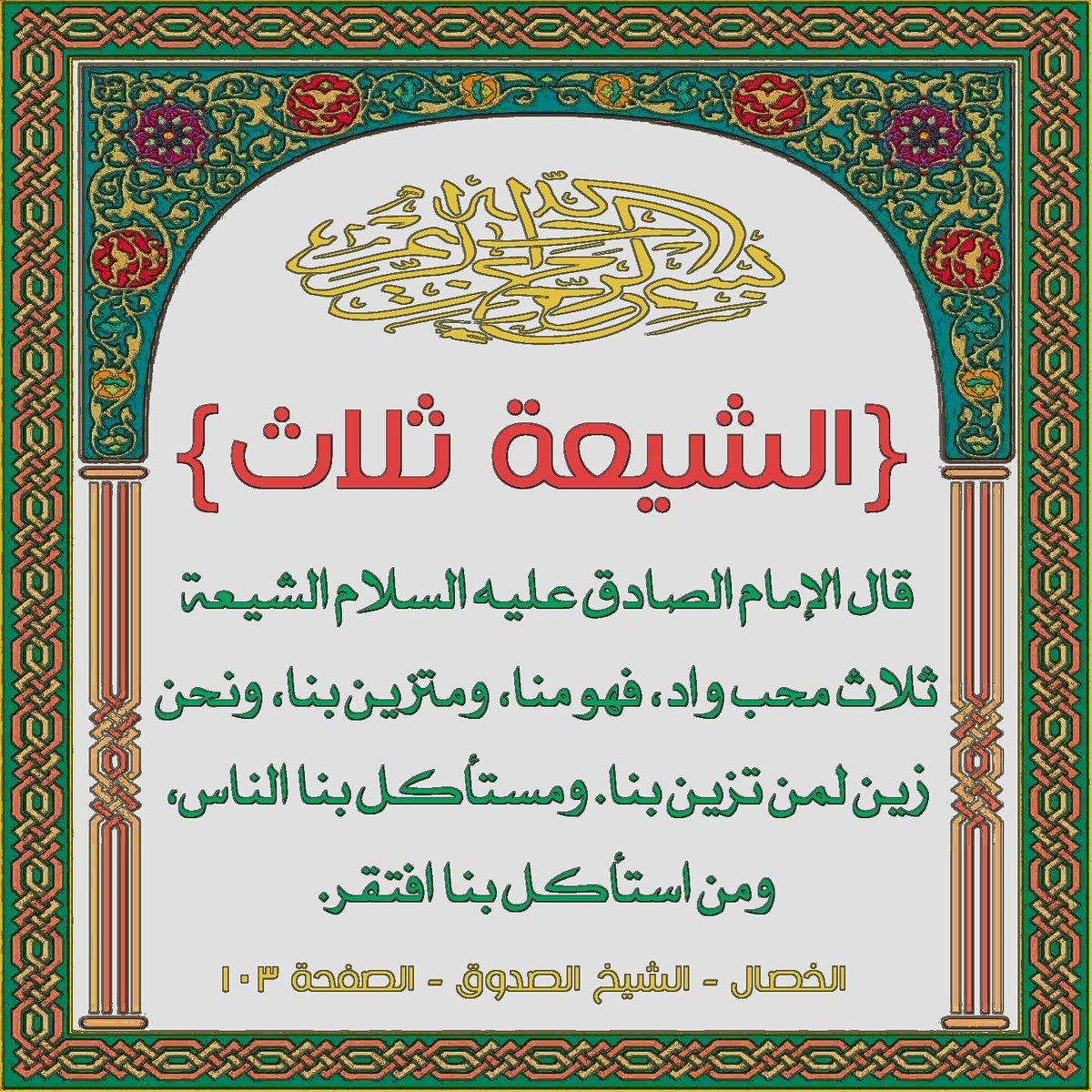 عَنْ أَبِي عَبْدِ اللَّه (عليه السلام) قَالَ:"شِيعَتُنَا هُمُ الشَّاحِبُونَ الذَّابِلُونَ النَّاحِلُونَ الَّذِينَ إِذَا جَنَّهُمُ اللَّيْلُ اسْتَقْبَلُوه بِحُزْنٍ... شِيعَتُنَا أَهْلُ الْهُدَى وأَهْلُ التُّقَى وأَهْلُ الْخَيْرِ وأَهْلُ الإِيمَانِ وأَهْلُ الْفَتْحِ والظَّفَرِ".