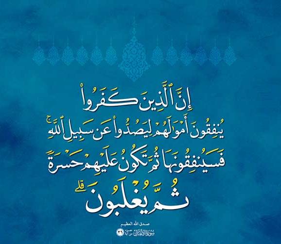 نزلت في قريش لما وافاهم ضمضم وأخبرهم بخبر رسول الله (صلى الله عليه واله) في طلب العير، فأخرجوا أموالهم وحملوا، وأنفقوا، وخرجوا إلى محاربة رسول الله (صلى الله عليه واله) ببدر، فقتلوا وصاروا إلى النار، وكان ما أنفقوا حسرة عليهم (1)