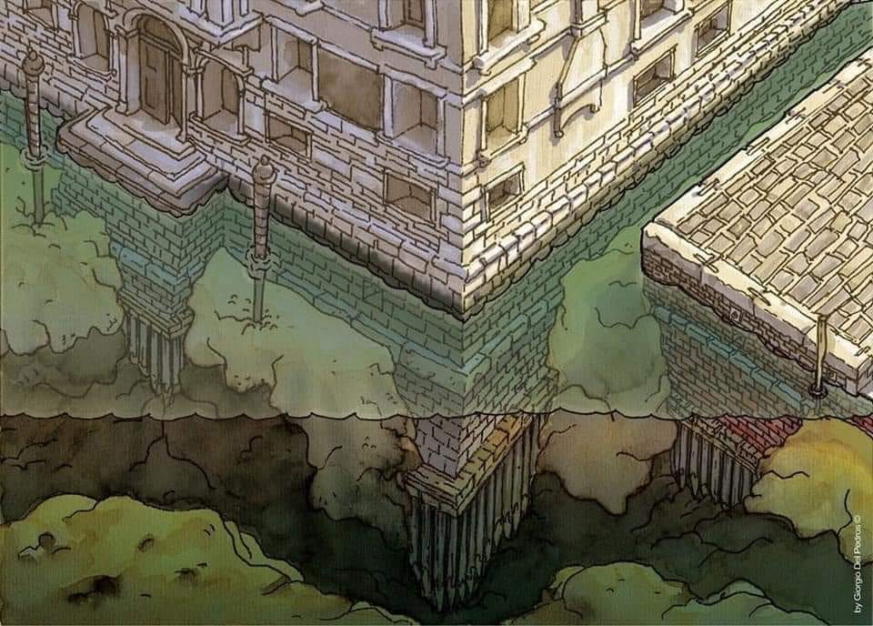 1. أساسات خشبية تحت الماء: الخشب المستخدم يبقى مغمورًا، مما يمنع تعفنه بسبب غياب الأكسجين.