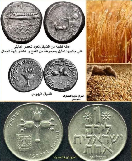 بأن العراقين أول من أوجد وتداول النقود في العالم والتاريخ ،وقد عُرفت العملة في العراق بإسم الشيقل ، وتعني الوزن في اللغة الاكدية حيثُ ينص قانون اورنمو السومري في العراق بحدود 4200 عام على دفع غرامات مالية بعملة الشيقل كتعويض للأضرار المختلفة ، ويعتبر الشعير من المواد الغذائية الأساسية والغالية في العراق القديم لذلك كان يستعمل للمقايضة بالبضائع قبل اختراع العملة ، وربما يكون ذلك السبب في جعله شعاراً للعملة العراقية القديمة