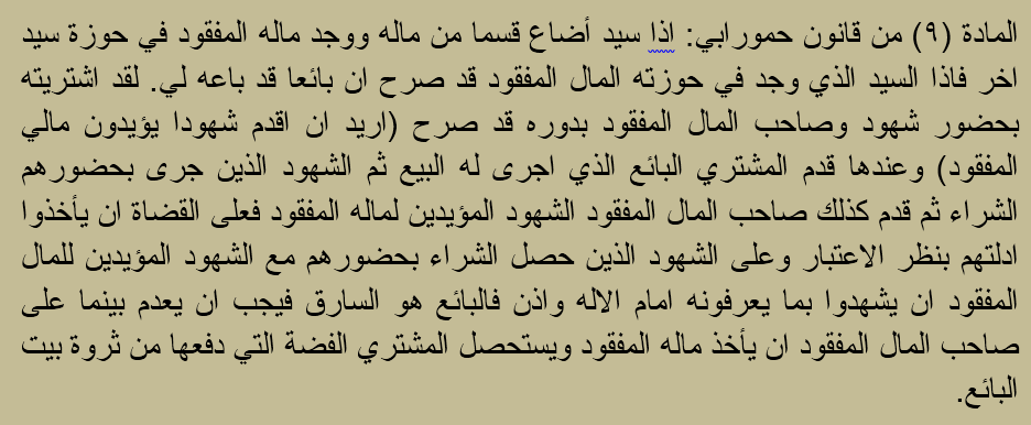 المادة (10) من قانون حمورابي: فاذا يقدم المشتري (المعترض) البائع الذي اجرى له البيع والشهود الذين بحضورهم حصل الشراء ثم صاحب المال قدم الشهود والمؤيدين لماله المفقود فالمشتري (المعترض) اذا هو السارق ويجب ان يعدم ولصاحب المال المفقود ان يؤخذ ماله المفقود.