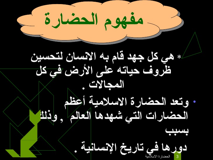 الحضارة: هي انعكاس لمجمل النشاط الانساني، وتمثل النشاطات الاجتماعية والاقتصادية والعلمية والسياسية والعسكرية والدينية، وهي صورة نابضة للتقدم العلمي في مجالات العلم والثقافة. ظهرت كلمة (Civilization) في اللغة الفرنسية عام 1734 (عصر الأنوار).