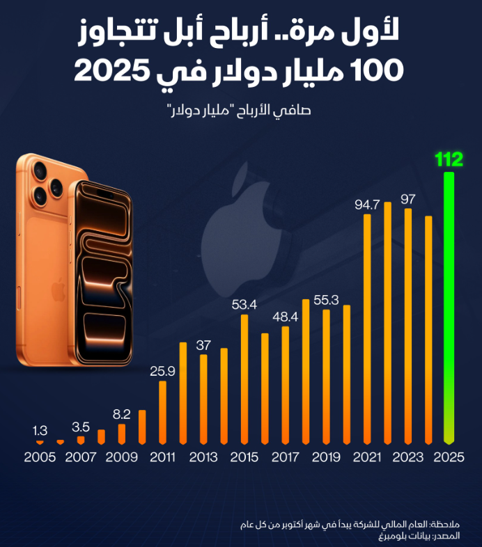 - حققت "أبل" صافي أرباح يُقدّر بـ 112 مليار دولار في العام المالي المنتهي في سبتمبر 2025، مقارنةً بـ 93.7 مليار في العام المالي السابق.
