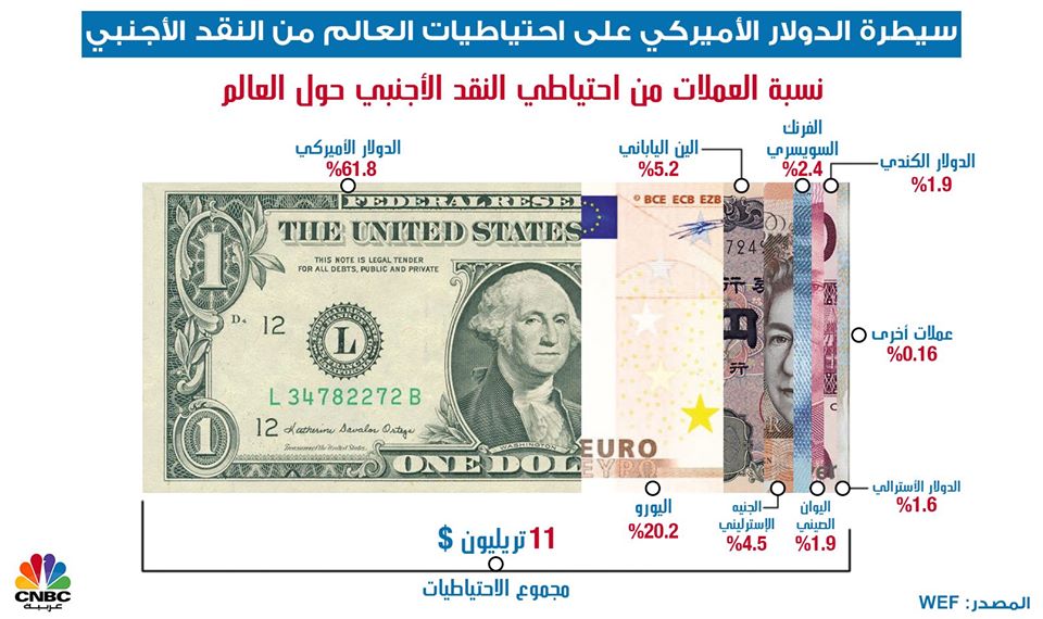 الدولار الأميركي يسيطر على احتياطيات النقد الأجنبي في العالم وبنحو 62% ( يشكل الدولار الأمريكي 61٪ من إجمالي احتياطيات البنوك المركزية من النقد الأجنبي)، مما يجعله العملة الأكثر شعبية وقوة في العالم ، يهيمن الدولار الأمريكي أيضا على سوق تداول العملات الأجنبية، ويشارك في حوالي 90٪ من إجمالي تداول الفوركس ، يشكل اليورو والدولار الأمريكي أكثر من 80٪ من احتياطي العالم من النقد الأجنبي ، على الرغم ان اليوان الصيني يشكل جزءًا كبيرًا من التجارة العالمية فإنه يمثل أقل من 2٪ من احتياطي العملات العالمية.