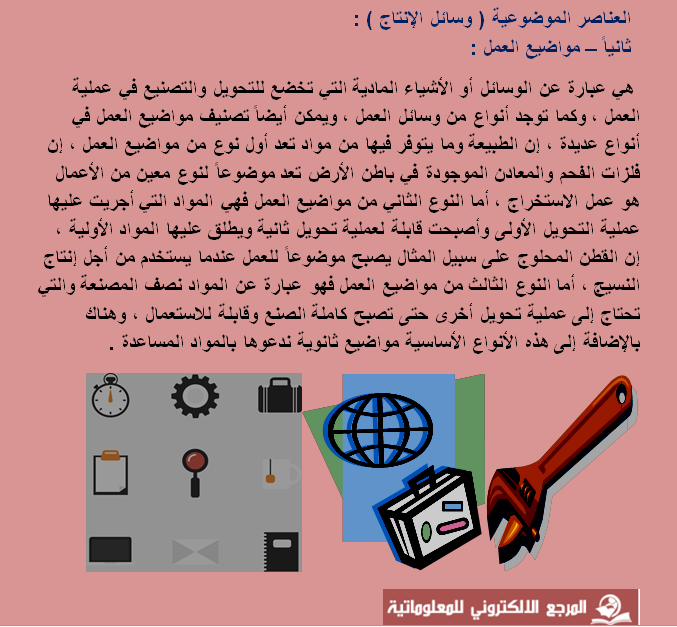 والخلاصة لنُنجز أي عملية عمل لابد لنا أولاً من توفر العنصر الذاتي وهو العمل الإنساني وثانياً العناصر المادية الموضوعية (وسائل الإنتاج) والتي تشمل وسائل العمل ومواضيع العمل ومتى توفرت هذه العناصر مجتمعة يكون المنتج الحصيلة والنتيجة الطبيعية لعملية العمل إلا أن درجة إشباع الحاجات الإنسانية تتوقف على مستوى إنتاجية العمل ،وفي الوقت الذي يعمل فيه الإنسان على تحقيق المنتج لإشباع حاجاته فهو يسعى بصورة دائمة إلى زيادة عدد المنتجات ومن أجل تحقيق هذا الغرض فإن الإنسان يعمل على الدوام لتطوير العمل وتحسينه.