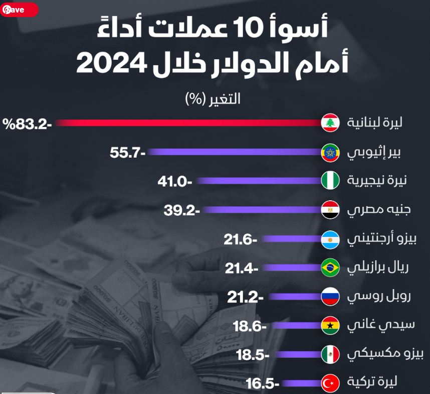 أسوأ 10 عملات أداءً بالعام الماضي ومن بينهما #الليرة اللبنانية و #الجنيه المصري و #الليرة التركية.