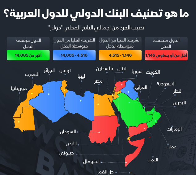 الخريطة الكاملة للدول العربية وفقا لتصنيف #البنك_الدولي من حيث نصيب الفرد من إجمالي الناتج المحلي .