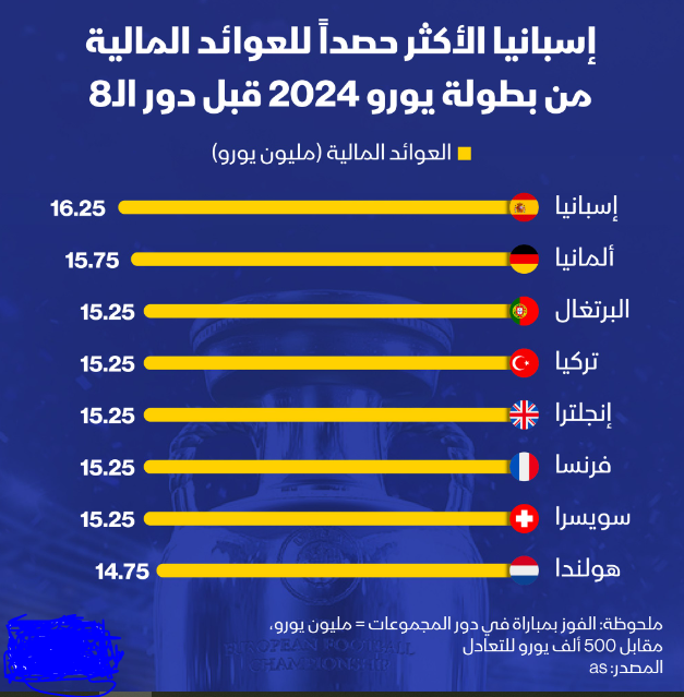 منتخب #إسبانيا هو أعلى منتخبات #يورو_2024 حصداً للجوائز المالية حتى دور الثمانية مستفيداً من تحقيقه الفوز في جميع مبارياته بدور المجموعات ..