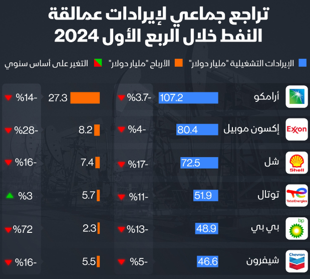 إيرادات عمالقة #النفط حول العالم تتعرض لانخفاض جماعي في الربع الأول من العام الجاري، وشركة #شل تسجل أكبر وتيرة هبوط بنحو 17% على أساس سنوي .