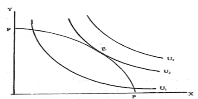 يبين الشكل اعلاه منحنى امكانيات الانتاجPP الذي يوضح الخلطات الممكن انتاجها من سلعتين هماX وY.ان اي نقطة علىPP تمثل نقطة كفاءة انتاجية. اما المنحنياتU 1,U2 ,U3 ،فتمثل منحنيات السواء بالنسبة لفرد ما في المجتمع. ويلاحظ ان نقطة واحدة فقط علىPP تحقق تعظيم المنفعة،وهي النقطة E،حيث يمس المنحنىPP منحنى السواء الاعلى للفرد،اي U2 وعند نقطة التماس هذه نجد ان معدل الاحلال الحدي للفرد(بالنسبة للسلعة X على Y) يساوي المعدل التقني للتحويل السلعي بالنسبة لـ X علىYوهذا هو الشرط المطلوب لتحقيق الكفاءة الاجمالية.