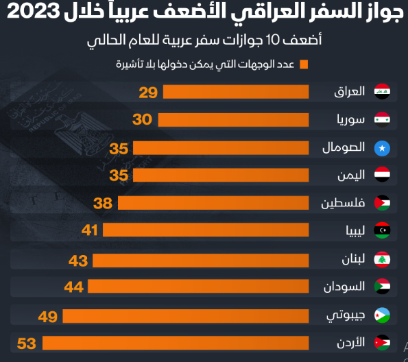 أظهرت بيانات "هينلي آند بارتنرز" أن جواز السفر العراقي هو الأضعف عربياً من حيث عدد الوجهات التي يمكن الوصول إليها بدون تأشيرة، فيما تضمنت قائمة أضعف 10 جوازات سفر عربية، سوريا والصومال وكذلك اليمن وفلسطين وليبيا ولبنان.