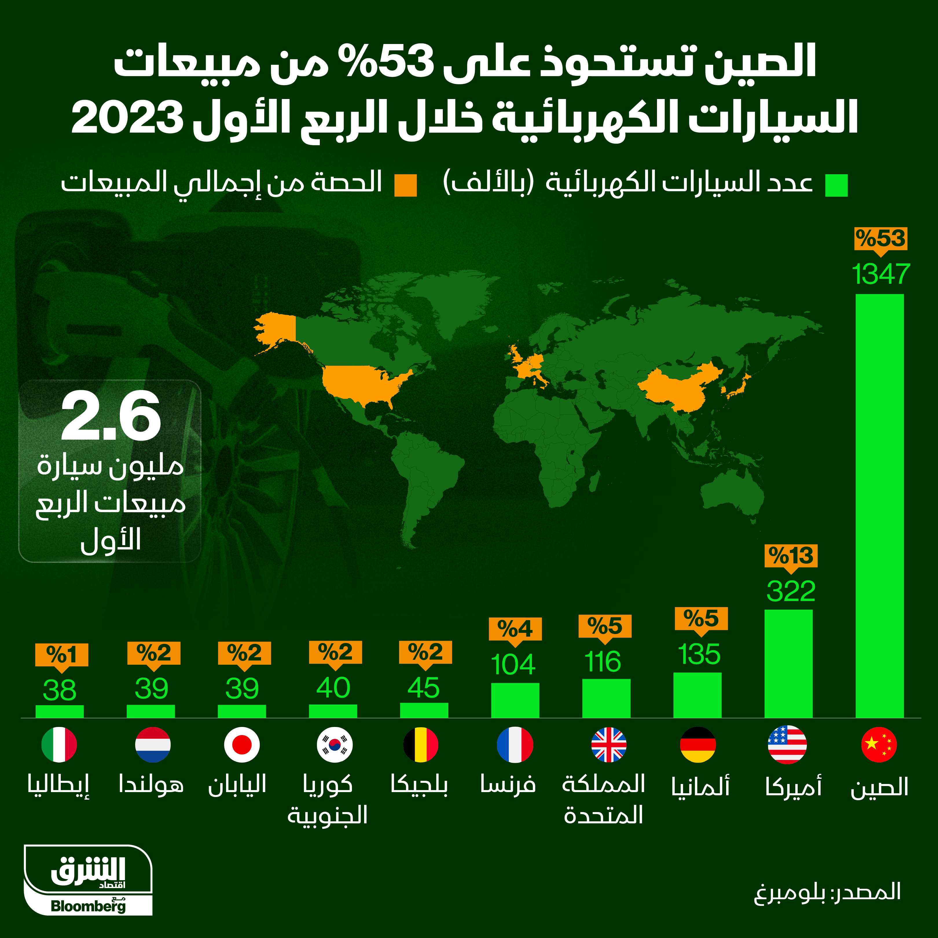 استحوذت الصين على نصيب الأسد من السيارات الكهربائية المَبيعة حول العالم في الربع الأولمن هذا العام بحصة قدرها 53%، متفوقة بفارق كبير على الولايات المتحدة التي احتلت المركز الثاني بحصة 13%.