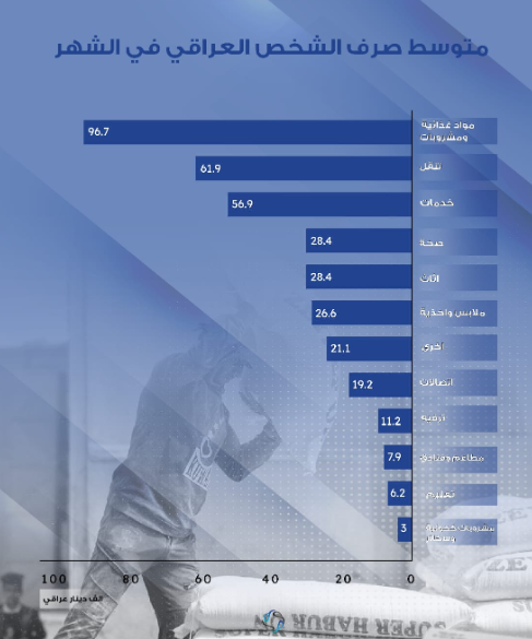 بلغ معدل استهلاك المواطن العراقي شهريا من مختلف السلع والخدمات بحدود ٣٦٥ الف دينار. وبحسب اخر تقدير للسكان فأن عدد السكان في العراق بلغ ٤٢ مليون نسمة اي ان العراقيين شهريا يصرفون ما قيمته ١٥ ترليون دينار شهريا و ١٨٣ ترليون دينار سنويا وهذا الرقم قابل للزيادة اعتمادا على تغيير نمط الاستهلاك وزيادة عدد السكان في البلد .