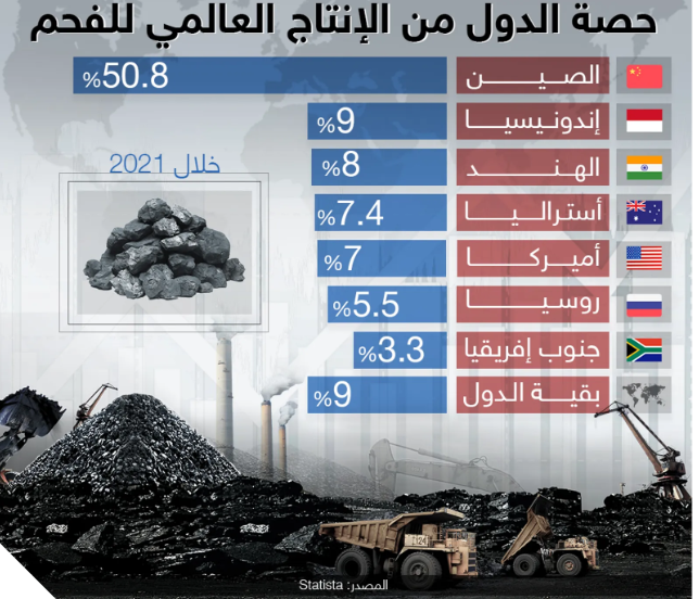 الصين تسيطر على أكثر من نصف الإنتاج العالمي للفحم .