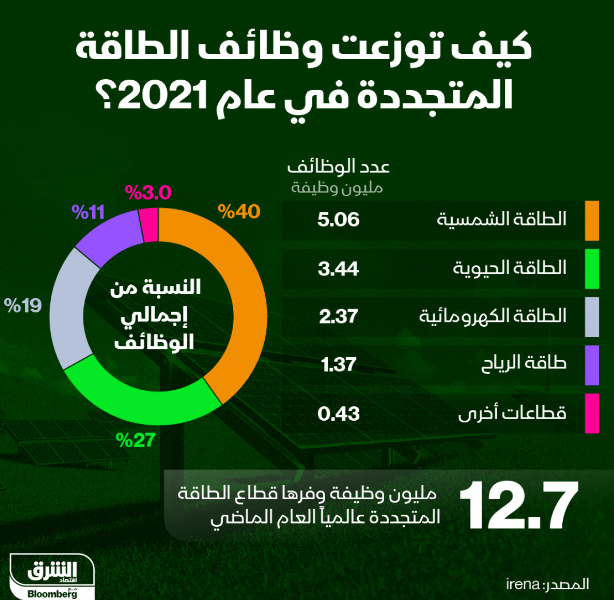 أدناه قطاعات الطاقة المتجددة الأكثر توظيفاً .