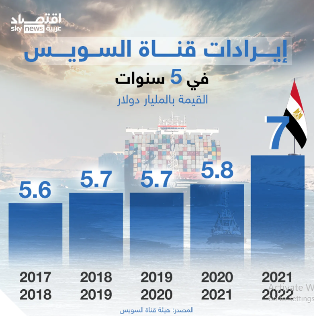 حققت قناة السويس المصرية أعلى إيرادات في تاريخها خلال العام المالي الماضي 2021-2022، بقيمة 7 مليارات دولار مقابل 5.8 مليار دولار في العام المالي السابق بزيادة قدرها 20.7 بالمئة.
