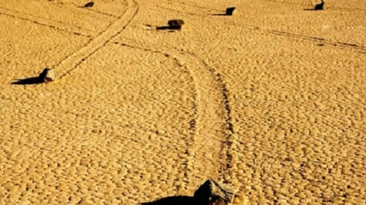 في صحراء كاليفورنيا ونيفادا، تتحرك الصخور الكبيرة أحيانًا عبر أرض الصحراء تاركة آثارًا طويلة رغم وزنها الثقيل والاحتكاك الكبير مع الأرض. تفسر الظاهرة بأن طبقة رقيقة من الطين أو المياه فوق الأرض تقلل الاحتكاك بشكل كبير، فتدفعها الرياح القوية أثناء العواصف، مما يسمح للصخور بالتحرك لمسافات طويلة بطريقة طبيعية غير متوقعة، رغم قلة حدوث الظروف المناسبة. يُعد تقليل قوة الاحتكاك بين الصخور والأرض عاملاً رئيسيًا في تسهيل هذه الحركة الغريبة.