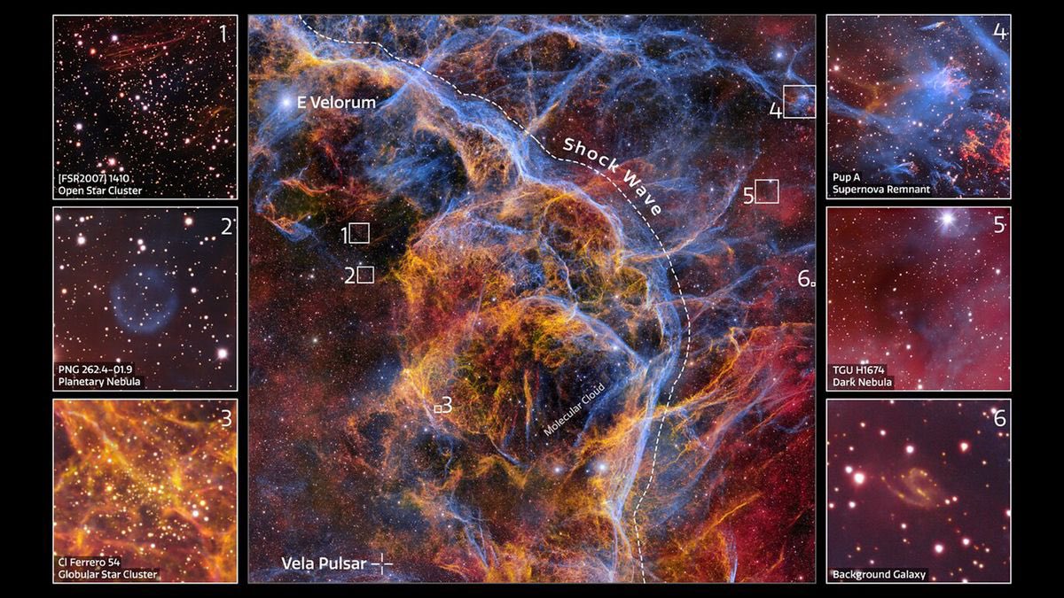 هذه الكتلة المتصاعدة من خيوط الغبار ومحاليق الغازات الممتدة عبر 100 سنة ضوئية من الفضاء مثل الدانتيل الرقيق هي بقايا المستعر الأعظم Vela ، رماد متناثر لنجم انفجر منذ حوالي 11000 سنة.