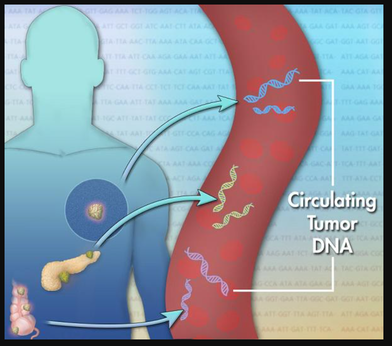 هو جزء من الحمض النووي الموجود في الدم ويأتي تحديداً من الخلايا السرطانية. عند موت هذه الخلايا تطلق أجزاء من مادتها الوراثية في مجرى الدم. ويمكن تحليل هذا الحمض النووي للكشف عن وجود السرطان ومعرفة الطفرات الجينية الموجودة فيه ومتابعة استجابة المريض للعلاج أو اكتشاف إذا عاد الورم بعد العلاج. ويستخدم ذلك في ما يسمى الخزعة السائلة وهي طريقة غير جراحية وآمنة لفحص الورم من خلال عينة دم فقط.