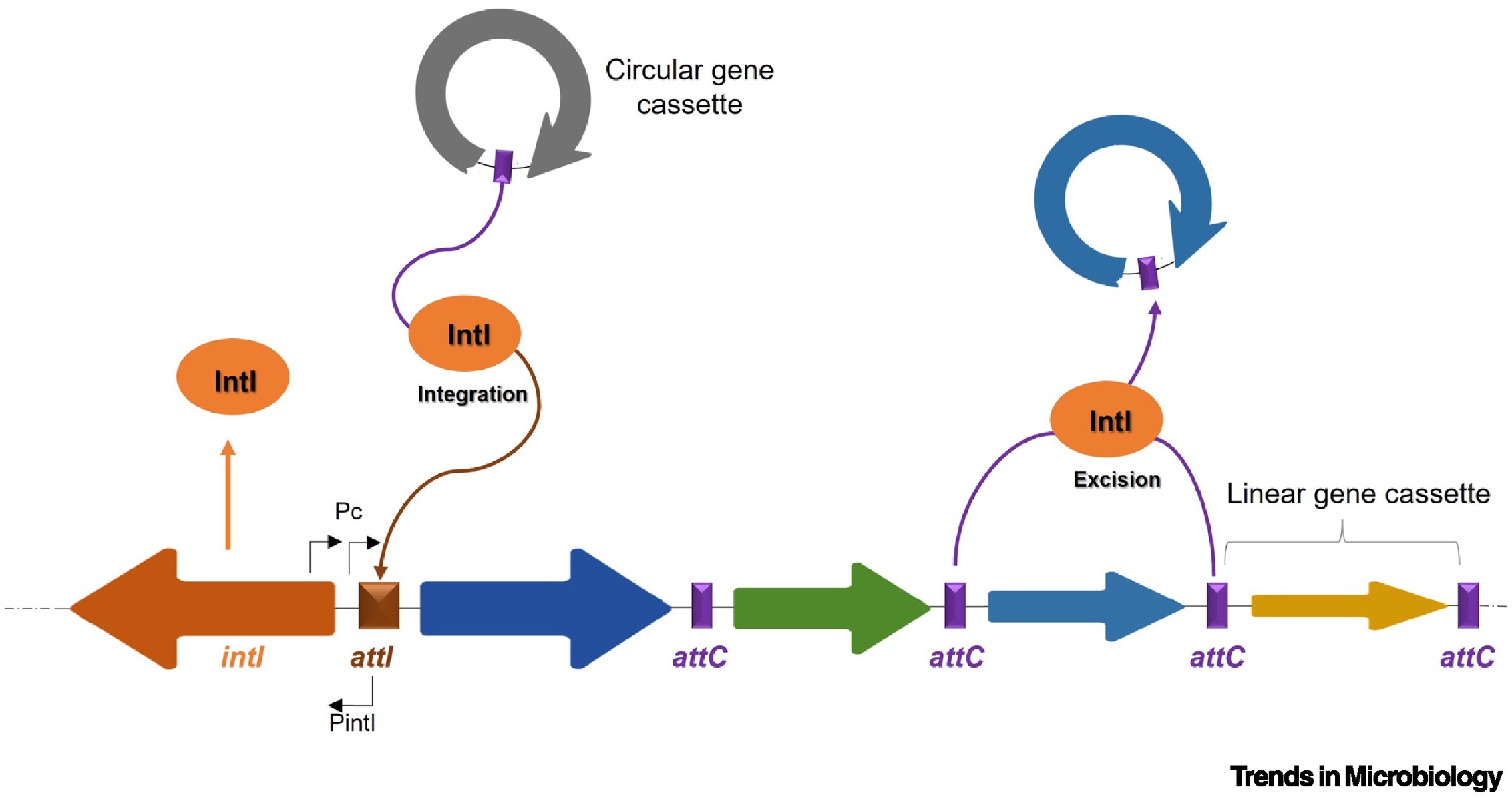 هو عنصر وراثي بكتيري وظيفته جمع ودمج وحدات جينية صغيرة تسمى gene cassettes التي غالباً ما تحتوي على جينات مقاومة للمضادات الحيوية. يحتوي على جين intI الذي يشفر إنزيم Integrase المسؤول عن إدماج أو إزالة هذه الوحدات عند الموقع المحدد attI. كما يحتوي على محفز داخلي Pc يتيح التعبير الأساسي عن الجينات الموجودة ضمن الـ cassettes. الـIntegron نفسه غير متنقل بشكل مستقل ولكنه يمكن أن ينتقل بين البكتيريا إذا كان موجوداً ضمن عناصر وراثية متنقلة مثل البلازميدات أو transposons