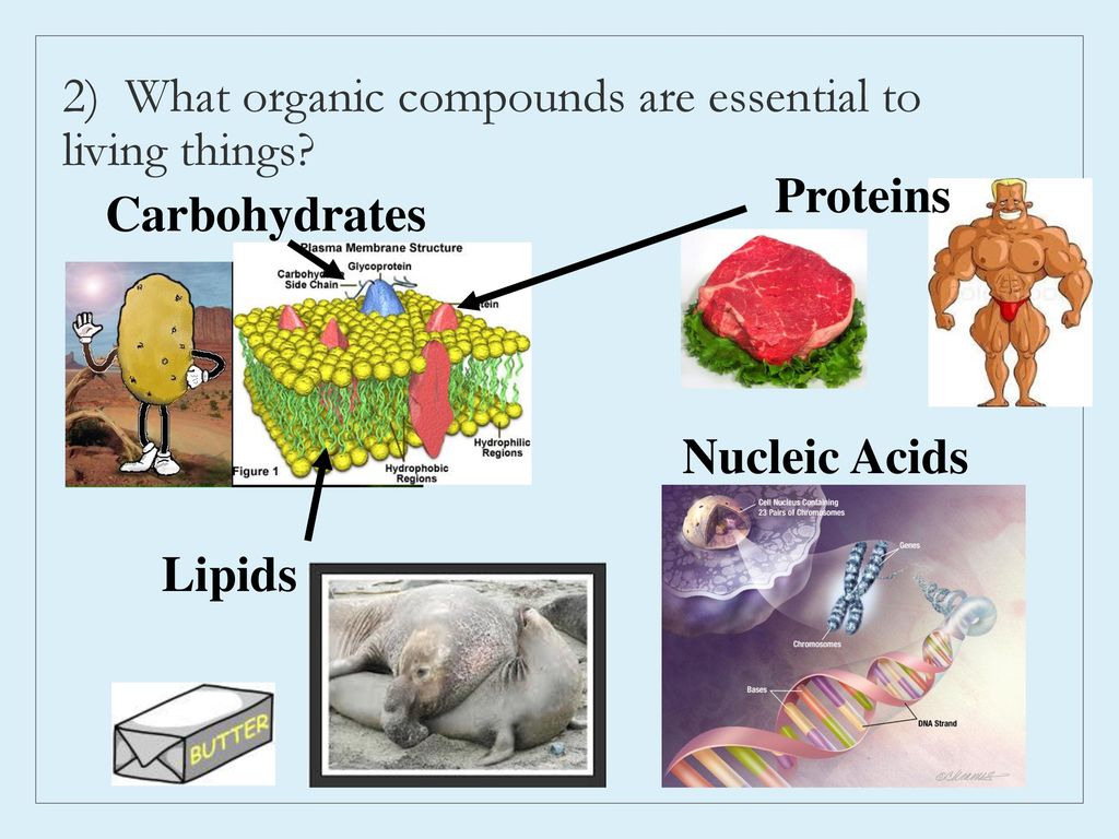 ثمة اربعة انواع من المركبات العضوية Organic Compounds الرئيسة التي تتركب منها اجسام الكانتات الحدة ، وهي : الكاربوهيدرات Carbohydrates (السكريات) ، البروتينات Proteins ، اللبيدات Lipids (الدهون) ، الحوامض النووية Nucleic Acids.ان لهذه المركبات وظائف متنوعة ، منها ما هو اساسي ، ويدخل في بناء اجسام هذه الكائنات ، ومنها ما هو كفيل بتزويد اجسامها بالطاقة اللازمة لقيام بالافعال الحياتية (الحيوية) كافة ، ومنها ما هو مسؤول عن نقل الصفات في الكائنات من جيل الى آخر .
