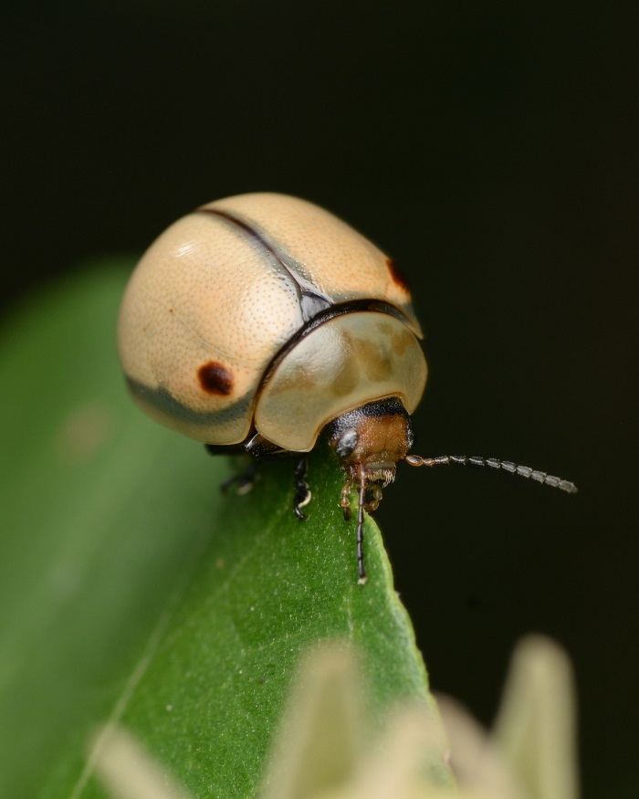 الخنفساء محدبة الشكل، وهى صغيرة الحجم، إذ لا يتعدى طول جسمها سنتيمتر واحد. الغمدان (الجناحان الأماميان المتغلظان) لونهما أبيض كريمي ومقدم الصدر لونه أبيض لؤلؤي. وتوجد نقطة بلون بني غامق قريبة من الحافة الأمامية…