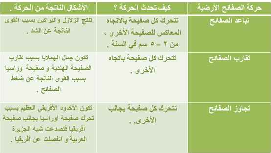 حركة الصفائح الأرضية : تتحرّك الصفائح الأرضية باستمرار، وينتج عن هذه الحركة تغييرات في توزيع القارات، كما يمكن أن ينتج عنها البراكين والزلازل، والسبب الأساسي الكامن خلف هذه الحركة هو الجاذبية الأرضية فضلًا عن الحمل الحراري الناتج عن اختلاف كثافة الصفائح، ويُقال بأنّ حركة الصفائح بدأت منذ أكثر من 3 مليارات عام، ويحدّد نوع حدود الصفائح تِبعًا لطبيعة حركة كل صفيحة بالنسبة للأخرى، فمنها الصفائح المتقاربة، ومنها المتباعدة، ومنها ما يسير معاكسًا لبعضه البعض.