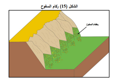 ركام السفوح : يعد ركام السفوح ناتج لتجوية صخور السفوح العليا ثم ينقل ناتج التجوية بفعل عوامل النقل الماء - الرياح - الجاذبية الأرضية ويترسب عند قاعدة المنحدر بشكل هشيم صخري (Talus) ويسمى أحياناً .(Scree). ويكون له دور مهم في حماية السفوح الدنيا من العمليات الجيومورفية، وأحياناً يتخذ الهشيم أشكالاً شديدة الانحدار شبيهة بالمروحة الغرينية يسمى مخروط الهشيم (Talus Cone) ويسمى كولوفيوم (Colluvium)وهي كلمة لاتينية معناها ركام .