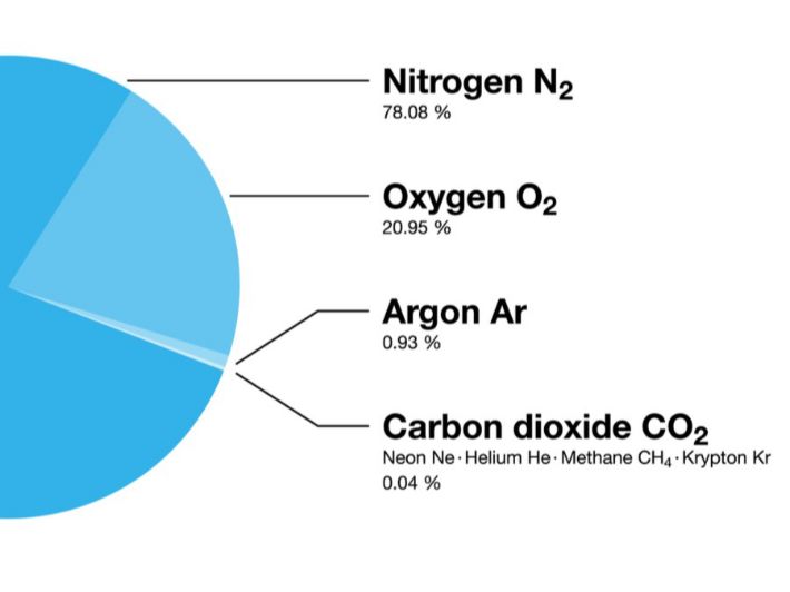 يتكون الهواء المكون للغلاف الجوي من خليط من الغازات المختلفة، وعلى الرغم من أهمية غاز الأكسجين للحياة على الأرض إلا أن غالبية الغلاف الجوي مكونة من النيتروجين؛ إذ يتكون الغلاف الجوي من نحو 78% من النيتروجين، و21% من الأكسجين، و0.9% من الأرجون، و0.1% من غازات أخرى، التي تشمل كميات ضئيلة من ثاني أكسيد الكربون، والميثان، وبخار الماء، والنيون، والهيدروجين، والهيليوم.
