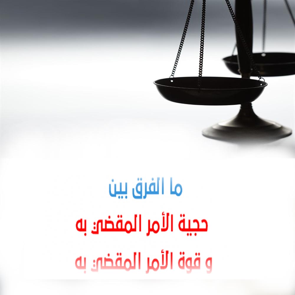 الفرق بين ﺣﺠﻴﺔ ﺍﻻﻣﺮ ﺍﻟﻤﻘﻀﻲ ﺑﻪ وﻗﻮﺓ ﺍﻻﻣﺮ ﺍﻟﻤﻘﻀﻲ ﺑﻪ / ﺣﺠﻴﺔ ﺍﻻﻣﺮ ﺍﻟﻤﻘﻀﻲ ﺑﻪ : ﻫﻲ ﺍﻟﺤﺠﻴﺔ ﺍﻟﺘﻲ ﺗﻜﻮﻥ ﻟﺠﻤﻴﻊ ﺍﻻﺣﻜﺎﻡ ﺍﻟﻘﻄﻌﻴﺔ ﻭﺍﻟﺘﻲ ﻳﺠﻮﺯ ﺍﻟﻄﻌﻦ ﻓﻴﻬﺎ ﺑﺎﻟﻄﺮﻕ ﺍﻟﻌﺎﺩﻳﺔ . ﻗﻮﺓ ﺍﻻﻣﺮ ﺍﻟﻤﻘﻀﻲ ﺑﻪ :ﻫﻲ ﺍﻟﺤﺠﻴﺔ ﺍﻟﺘﻲ ﺗﻜﻮﻥ ﻟﺠﻤﻴﻊ ﺍﻻﺣﻜﺎﻡ ﺍﻟﻨﻬﺎﺋﻴﺔ ﻭﺍﻟﻘﻄﻌﻴﺔ ﻭﺍﻟﺘﻲ ﻻ ﻳﺠﻮﺯ ﺍﻟﻄﻌﻦ ﻋﻠﻴﻬﺎ ﺑﺎﻟﻄﺮﻕ ﺍﻟﻌﺎﺩﻳﺔ ﺑﻴﻨﻤﺎ ﻳﺠﻮﺯ ﺍﻟﻄﻌﻦ ﻓﻴﻬﺎ ﺑﺎﻟﻄﺮﻕ ﻏﻴﺮ ﺍﻟﻌﺎﺩﻳﺔ .