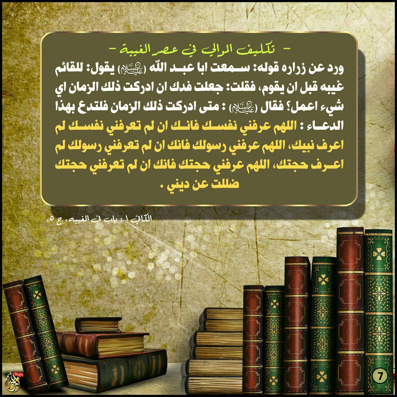 ورد عن زراره قوله : سمعت أبا عبد الله (عليه السلام) يقول : للقائم غيبه قبل أن يقوم ، فقلت : جعلت فداك ان ادركت ذلك الزمان اي شيء أعمل ؟ فقال (عليه السلام) : متى ادركت ذلك الزمان فلتدع بهذا الدعاء : اللهم عرفني نفسك فانك ان لم تعرفني نفسك لم اعرف نبيك ، اللهم عرفني رسولك فإنك ان لم تعرفني رسولك لم اعرف حجتك ، اللهم عرفني حجتك فإنك ان لم تعرفني حجتك ضللت عن ديني .