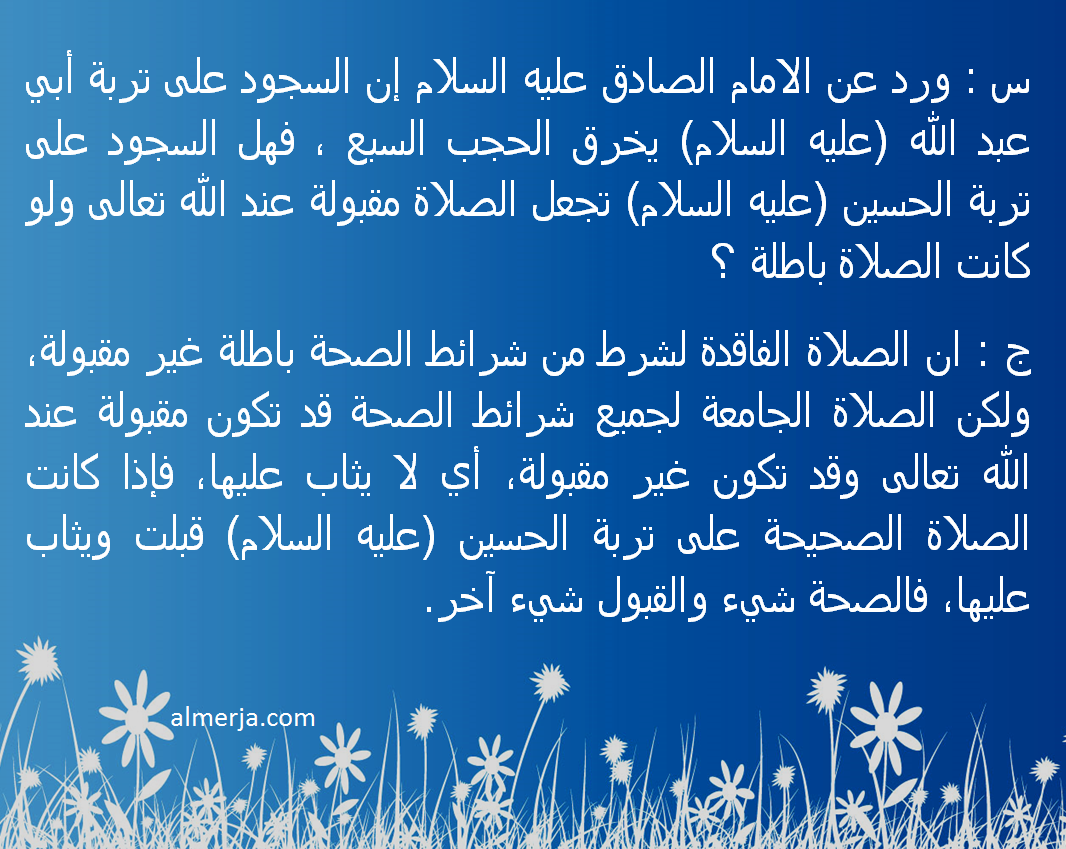 س : ورد عن الامام الصادق عليه السلام إن السجود على تربة أبي عبد الله (عليه السلام) يخرق الحجب السبع ، فهل السجود على تربة الحسين (عليه السلام) تجعل الصلاة مقبولة عند الله تعالى ولو كانت الصلاة باطلة ؟