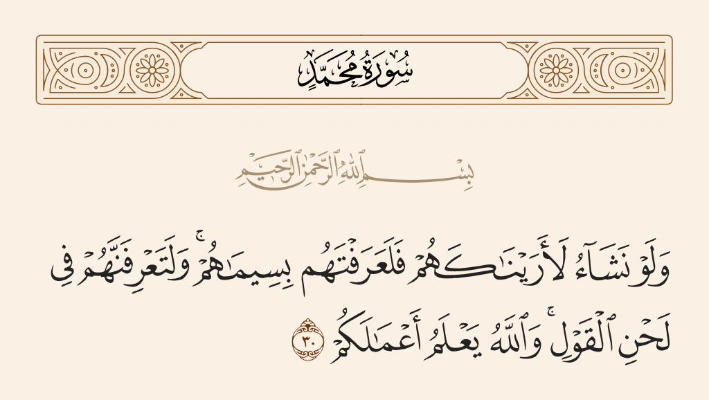 في مجمع البيان وعن أبي سعيد الخدري قال: لحن القول بغضهم علي بن أبي طالب (عليهما السلام)، قال: كنّا نعرف المنافقين على عهد رسول الله (صلى الله عليه وآله) ببغضهم علي بن أبي طالب، وروي مثل ذلك عن جابر بن عبد الله الأنصاري، وعن عبادة بن الصامت قال: كنّا نبور [باره: جرّبه واختبره] أولادنا بحب علي بن أبي طالب، فإذا رأينا أحدهم لا يحبّه علمنا أنّه لغير رشدة. قال أنس: ما خفي منافق على عهد رسول الله (صلى الله عليه وآله) بعد هذه الآية.