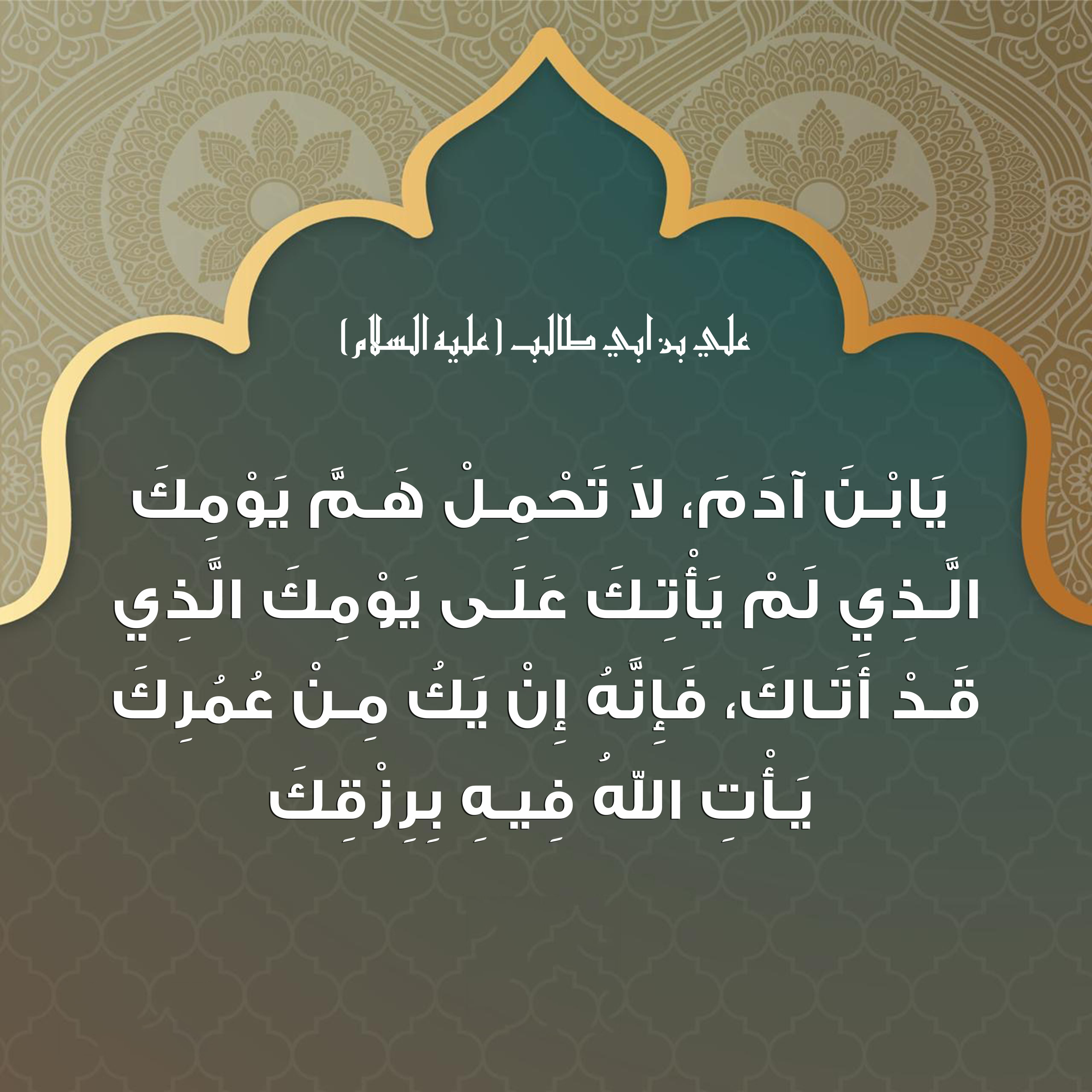 يَا ابْنَ آدَمَ لَا تَحْمِلْ هَمَّ يَوْمِكَ الَّذِي لَمْ يَأْتِكَ عَلَى يَوْمِكَ الَّذِي قَدْ أَتَاكَ فَإِنَّهُ إِنْ يَكُ مِنْ عُمُرِكَ يَأْتِ اللَّهُ فِيهِ بِرِزْقِكَ.