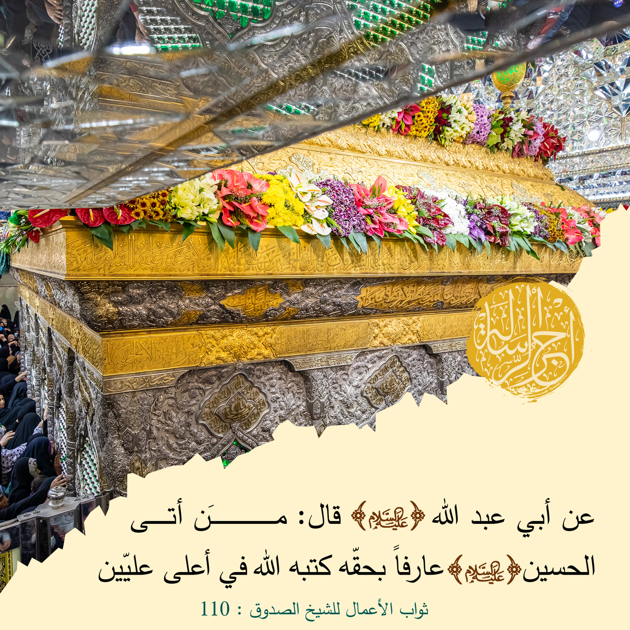 عن أبي عبد الله الصادق (عليه السلام) قال: منّ أتى للحسين (عليه السلام) عارفًا بحقّه كتبه الله في أعلى عليّين.