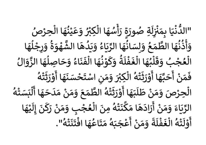 "إِذَا اسْتَقْبَلْتَ الْقِبْلَةَ فَآيِسْ مِنَ الدُّنْيَا وَمَا فِيهَا وَالْخَلْقِ وَمَا هُمْ فِيهِ وَفَرِّغْ قَلْبَكَ عَنْ كُلِّ شَاغِلٍ يَشْغَلُكَ عَنِ اللَّهِ تَعَالَى وَعَايِنْ بِسِرِّكَ عَظَمَةَ اللَّهِ عَزَّ وَجَلَّ وَاذْكُرْ وُقُوفَكَ بَيْنَ يَدَيْهِ".