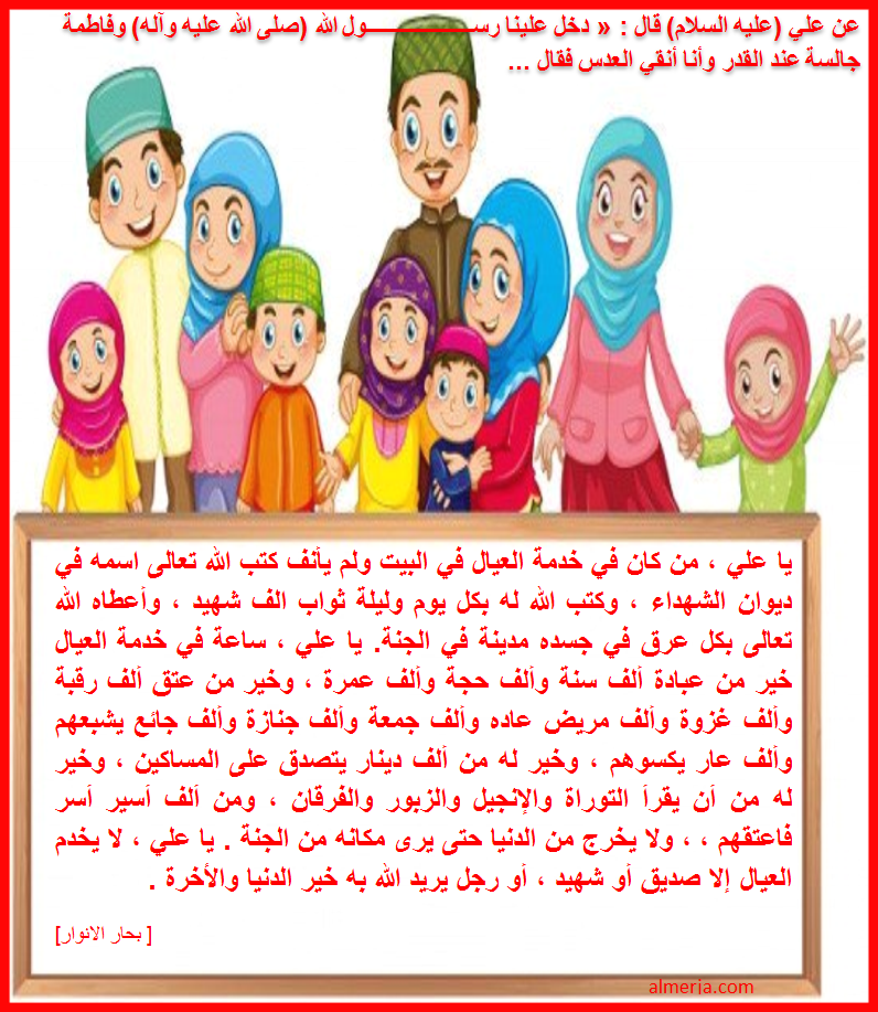 عن علي (عليه السلام) قال : « دخل علينا رســــــــــــــــــــول الله (صلى الله عليه وآله) وفاطمة جالسة عند القدر وأنا أنقي العدس فقال ...يا علي ، من كان في خدمة العيال في البيت ولم يأنف كتب الله تعالى اسمه في ديوان الشهداء ، وكتب الله له بكل يوم وليلة ثواب الف شهيد ، وأعطاه الله تعالى بكل عرق في جسده مدينة في الجنة. يا علي ، ساعة في خدمة العيال خير من عبادة ألف سنة وألف حجة وألف عمرة ، وخير من عتق ألف رقبة وألف غزوة وألف مريض عاده وألف جمعة وألف جنازة وألف جائع يشبعهم وألف عار يكسوهم ، وخير له..