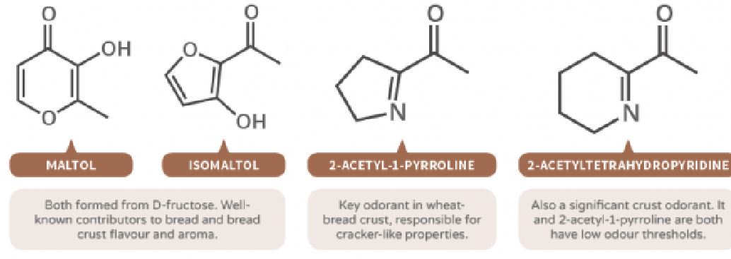 عند درجة حرارة عالية كالتي يتم عندها صناعة الخبز واعداد المعجنات وتأثير التحلل بفعل انزيم الخميرة تتفاعل الاحماض الامينية مع السكريات او تفاعل السكريات فيما بينها او مع نفسها لتعطي سلسلة من المركبات الحلقية المتطايرة مثل مركب اسيتايل بايرولين واسيتيل البايردين وحمض الاكتيك والمالتول وغيرها ووالتي تعطي للخبز والمعجنات روائحها المميزة