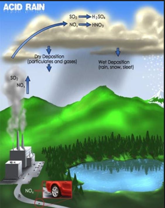 الامطار الحامضية : تنتج هذه الامطار نتيجة تلوث الجو بأكاسيد الكبريت والنتروجين وغيرها من المركبات في الجو بسبب دخان المصانع والسيارات ومخلفات الاحتراق وغيرها تختلط وتتفاعل هذه المكونات مع بخار الماء الموجود في الجو ويتكثف على شكل مطر ويسبب المطر الحامضي تغير في البيئة الزراعية ودرجة حموضتها وقد يسبب بعض الاحيان في جعل هذه التربة غير صالحة للزراعة وقد يقتل بعض النباتات والمحاصيل الزراعية