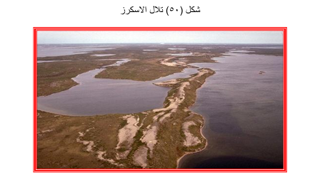 تلال الاسكرز Eskers : تتكون من الحصى ومفتتات الصخور المختلطة . مع الرمال ، وتتميز الحبيبات الصخرية باستدارتها وشكلها البيضوي أو الكروي وسطحها الأملس ، مما يدل دلالة واضحة على تأثرها بالتعرية المائية . ويوضح الشكل (٥٠) تلال الاسكرز .