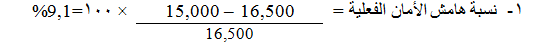 بفرض أن حجم التعادل لمنشأة "الأمل" هو15,000 وحدة وأن كمية المبيعات الفعلية التي تحققت خلال عام 2013 بلغت 16,500 وحدة وأن نسبة هامش الأمان المخططة 20%.