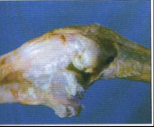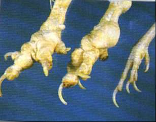شكل نقرس الأحشاء والمفاصل- ترسيبات من أملاح اليوريا حول مفاصل القدمين (الأولى من اليمين) قدم طبيعية للمقارنة