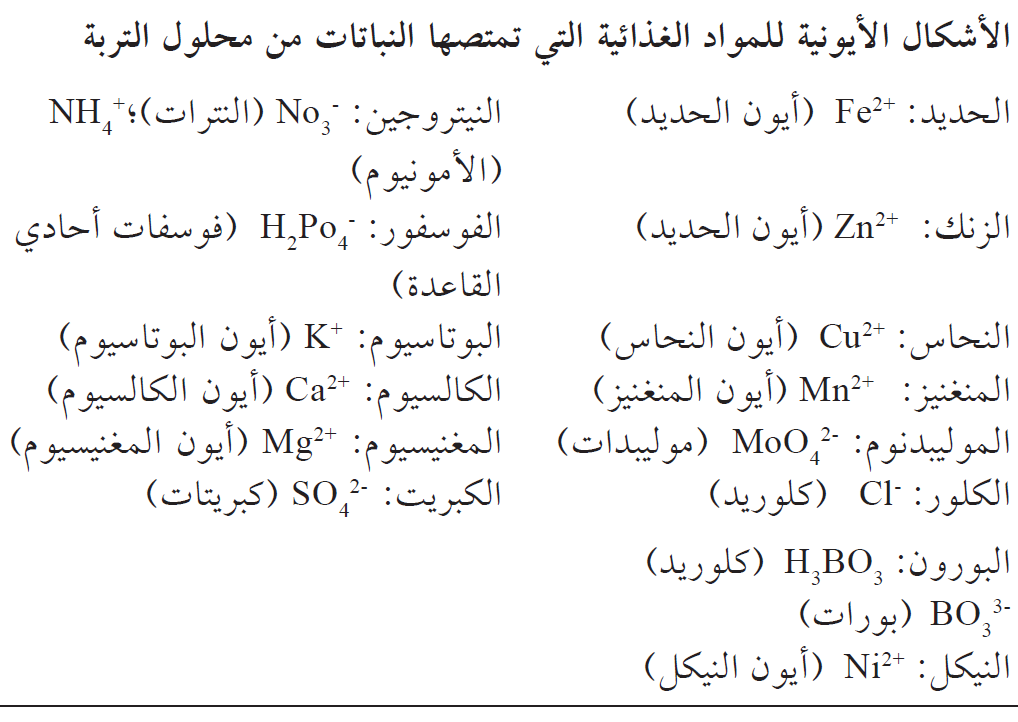 على الرغم من أن هذه الحقيقة لم يُعترف بها دائماً، تمتصّ النباتات المواد الغذائية المنقولة بالتربة عندما تكون العناصر الغذائية في محلول مائي فقط. كان يُعتقد في القرن السابع عشر، أن غرض الحرث هو تحويل التربة إلى جسيمات صغيرة حتى تستطيع أفواه الجذور الحصول على الغذاء من التربة. أيضاً، لا تُأخَذ المواد الغذائية بالتبادل المباشر بين الجذور والجسيمات الصلبة في التربة، على الرغم من أن هذا المفهوم كان من الصعب تبديده. مع احتمال استثناء البورون (Boron) تكون العناصر الغذائية في المحلول المائي في شكل أيوني (Ionic)، فهي جسيمات مشحونة في المحلول، (الجدول ادناه). هذه الأيونات هي أشكال المواد الغذائية التي تتوافّر على الفور للنباتات.