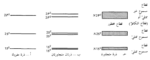 تنقسم المواد من حيث التوصيل الكهربائي إلى أقسام ثلاث هي العازلات وأشباه الموصلات والموصلات، وذلك تبعاً لتركيب شرائح الطاقة لهذه المادة. ولو نظرنا إلى الشكل 1ج نجد أن القطاع السفلي به N من الطاقات (السويات) يحتلها 2N من الإلكترونات وهو لا يتسع لأكثر من هذا العدد من الإلكترونات ولذلك فهو يسمى قطاع ممتلي كذلك القطاع الثاني به N من السويات ويحتله 2N من الإلكترونات وهو لا يتسع لأكثر من ذلك فهو الآخر قطاع ممتلي. وأما لقطاع لعلوي ففيه 2N من السويات أو 6N من السويات الفرعية ويمكن أن يسكنه 6N من الإلكترونات ، في حين أن عدد الإلكترونات الموجودة فعلاً هي 2N ، وبذلك يتسع هذا القطاع إلى 4N من لإلكترونات . ولذلك يحدد هذا القطاع تكافؤ العنصر ويسمى بقطاع التكافؤ. وواضح أن التكافؤ في هذا الشكل رباعي (الكربون رباعي التكافؤ) . كذلك توجد قطاعات أعلى يطلق عليها إسم قطاع لإثارة الغير محتل وهو القطاع الذي ينتج عند إنتقال الإلكترون من السوية 2P إلى السوية 3S في حالة الكربون. ويطلق على هذا القطاع إسم آخر هو قطاع التوصيل أو القطاع الفارغ .