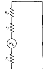 يمكن إيجاد معامل كسب المكبر بمصب مشترك والمعروف بإسم التابع المنبعي (شكل 1) بعد رسم الدارة المكافئة وإتباع نفس الأسلوب . عندئذ نجد أن معامل الكسب للجهد لهذه الدارة هو