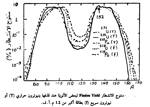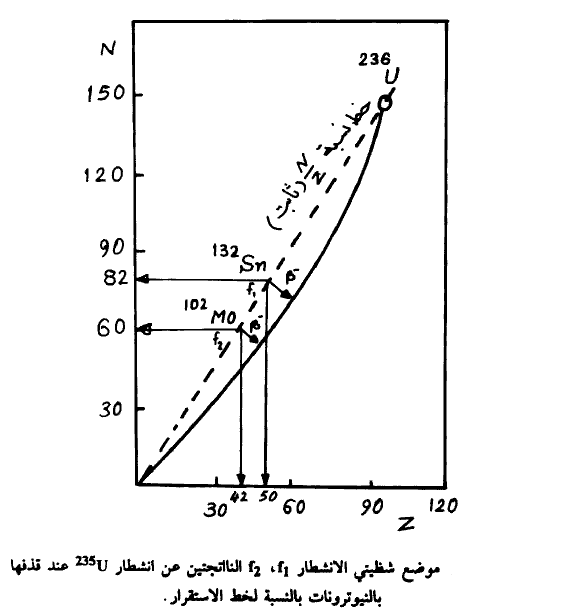 أن النواة ستنشطر عندما تكون مثارة وغير مستقرة وغالباً ما تكون أمثال هذه الأنوية غنية بالنيوترونات أي أن 1 <N/Z مثل U236 الناتجة عند قذف U235 بالنيوترونات. وحيث أن هذه النواة ستنشطر إلى نواتين أصغر منها فإن نسبة لإ لهاتين النواتين ستساوي غاباً نسبة N/Z للنواة الأم. يبين الشكل (1) موضع شظايا الانشطار بالنسبة لحظ الاستقرار النووي حيث نبين نواة U235 عند قذفها بالنيوترون فتنتج النواة المركبة U236 وهذه النواة غنية بالنيوترونات إذ أننا نجد أن 1.56 = N/Z وهكذا سيظل الحال بالنسبة لشظيتي الانشطار f2, f1 الناتجتين (أنظر الشكل 1). حيث نجد أن الشظية الأولى (f1) تقع عند النواة زوجية سحرية N = 82 ,Z = 50 ومن ثم فإننا نتوقع أن تكون النواة 132 =A أو القصدير (132-Sn) أهم الأنوية الناتجة عن الانشطار. يبين الشكل (2) منتوج الانشطار لبعض الأنوية عند قذفها بالنيوترونات حيث يتضح وجود هذه النواة لمعظم الحالات. كما نجد من الشكل (1) أن الشظية الأخرى (f2) تقع عند النواة 42 =Z و60 = N أي أن (102 = A) وهي نواة المولوبيدنيوم (Mo 102) . وهاتان النواتان لهما نفس النسبة N/Z كما لنواة U236 تقريباً. وبالتالي فهي أنوية غير مستقرة أي مشعة تقوم بإطلاق الجسيمات النووية فور تكونها للوصول إلى خط الاستقرار.