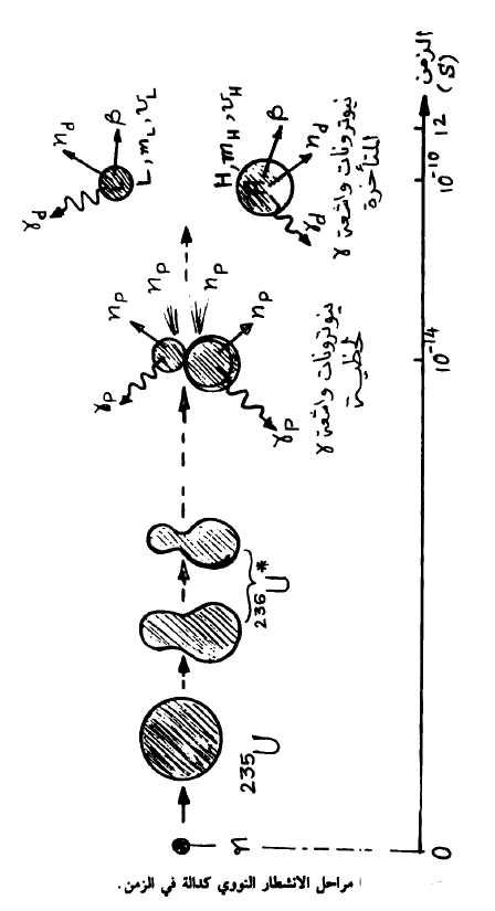 ويبين الشكل (3) مراحل الانشطار النووي كدالة في الزمن وانطلاق كل من النيوترونات اللحظية والمتأخرة. وقد وجد أن 99% من مجموع النيوترونات الناتجة عن الانشطار هي نيوترونات لحظية. ثم يتوقف انطلاق هذ النيوترونات حالا بعد الانشطار. أما النيوترونات المتأخرة فيستمر انطلاقها من شظايا الانشطار لفترة زمنية قد تصل إلى بضع ساعات حسب خصائص هذه النيوترونات حيث يتناقص عددها بمرور الزمن.