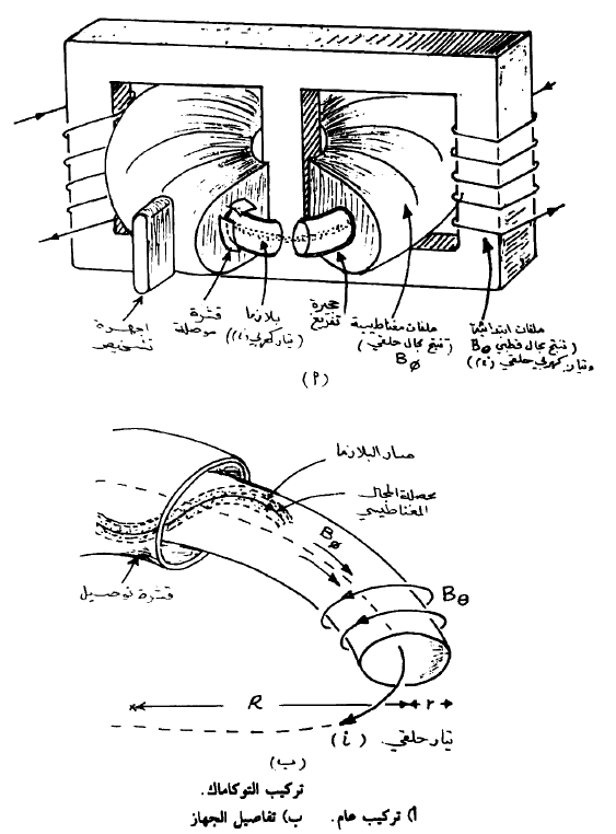 يبين الشكل (4) تركيب التوكاماك. حيث يبين الشكل (4 .ب) تفاصيل المجالات المغناطيسية الناتجة وكذلك التيار. تمر البلازما خلال الحلقة (Torus) حيث يؤثر عليها المجال الحلقي (∅B) والمجال القطبي (Bθ) وينتج عن ذلك مجال محصل يعمل على احتواء البلازما لتتدفق في الاتجاه المبين. كما وينتج عن الملفات الابتدائية تدفق تيار كهربي (i) يمر عبر البلازما الموصلة ويعمل على تسخينها.