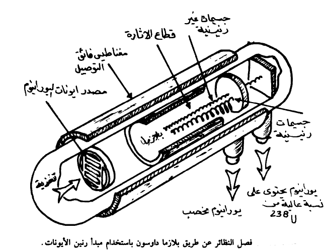 يبين الشكل (1) هذه التقنية. حيث يتم هنا تعريض البلازما الموجودة في مجال مغناطيسي منتظم وقوى إلى موجات منخفضة الطاقة وذات تردد راديوي. وينتج رنين بين هذه الموجات وإيونات اليورانيوم - 235 ذات التردد السيكلوتروني. ومن ثم يساعد الدوران على فصل U235 عن U عند وضع ألواح مجمعة Colletors238 عند وضع معين. كما هو مبين بالشكل.