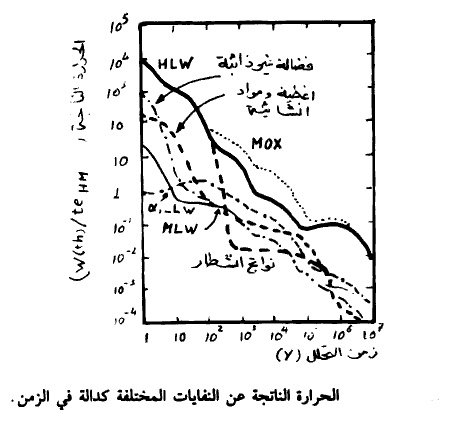 يبين الشكل (2) الحرارة الناتجة عن النفايات المختلفة كنواتج الانشطار والأكتينيدات ذات المحتويات الإشعاعية العاب HLW والمتوسطة MLW والمنخفضة LLW كدالة في الزمن. وبعد أن تملأ الحجرات بالمخلفات تردم بالرمال والصخور التي نتجت عن الحفر. ويخلي المكان.